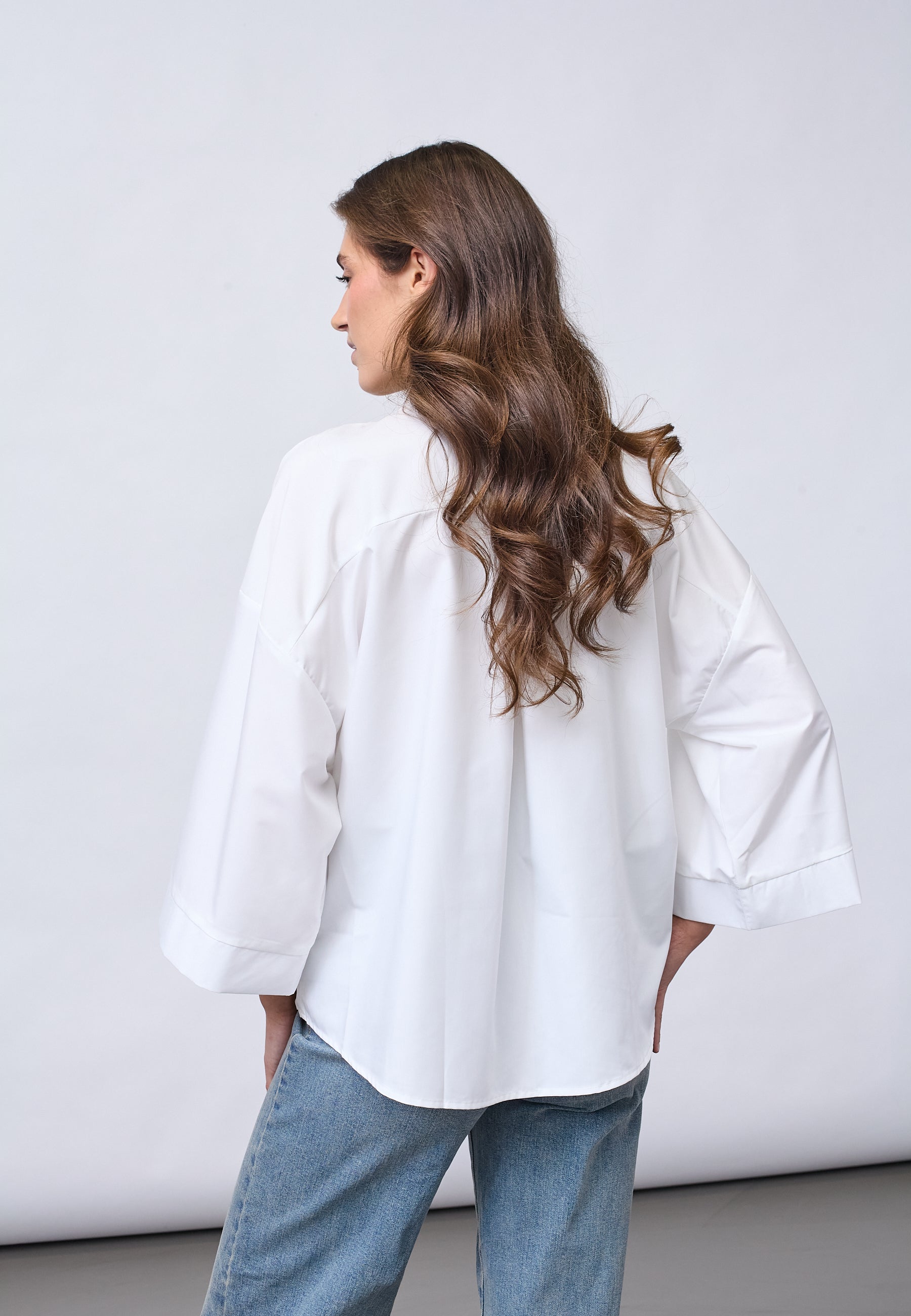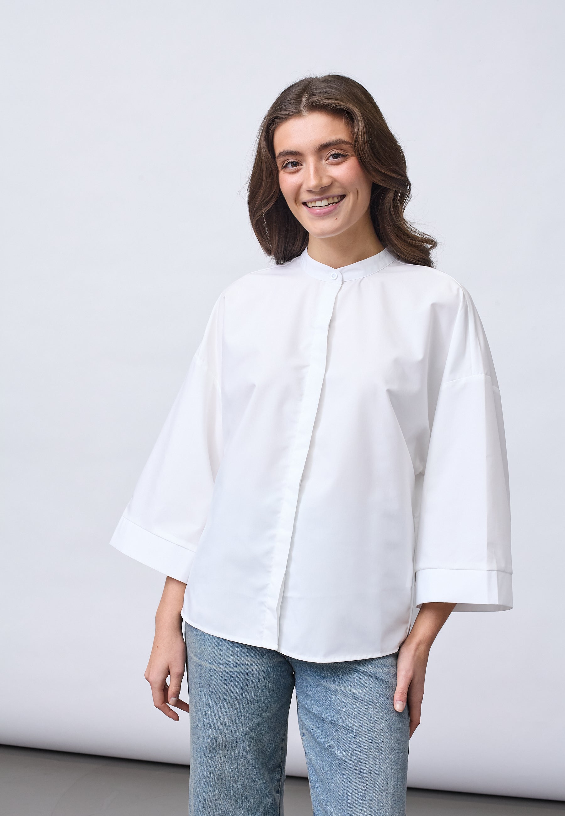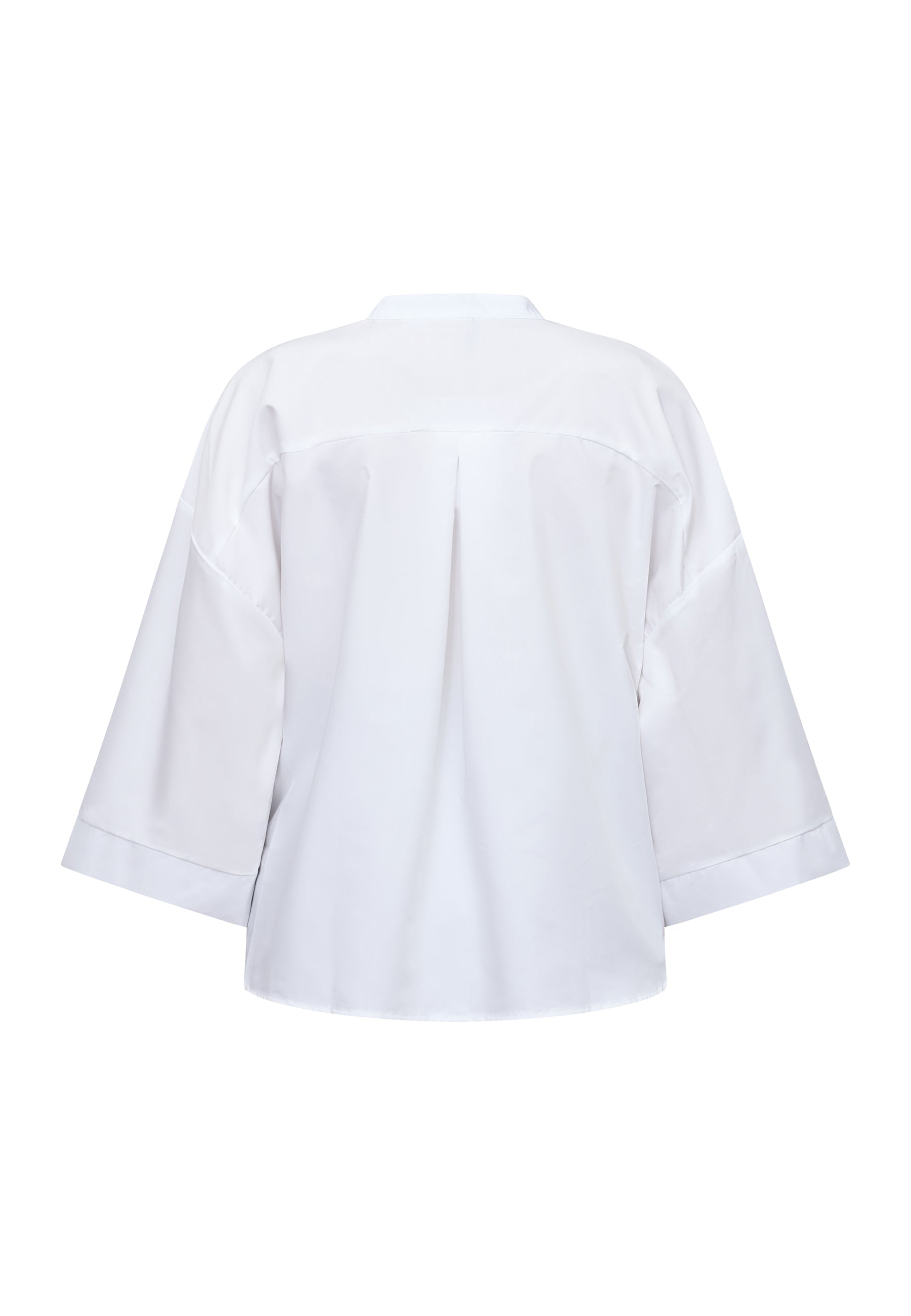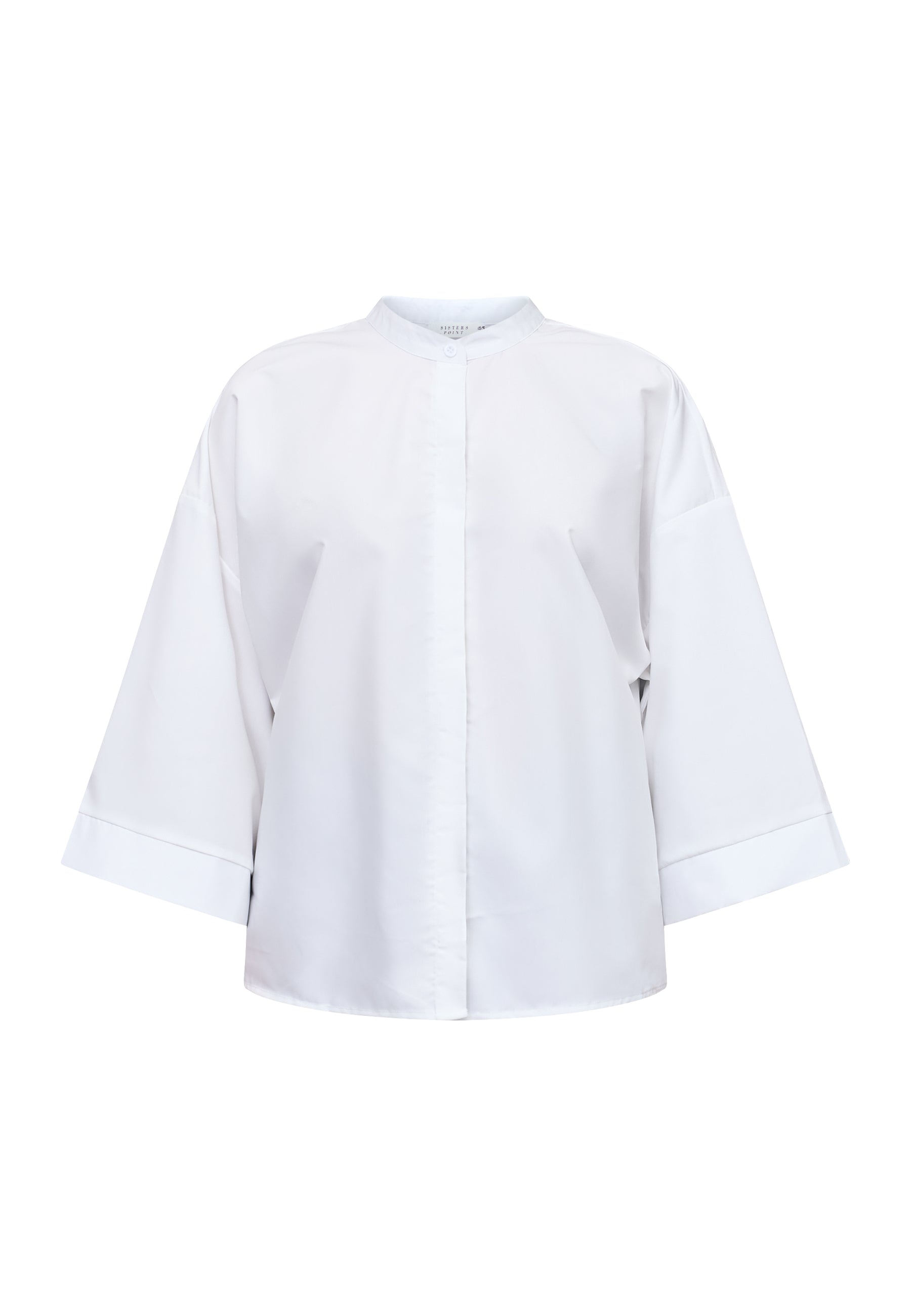 ELITE-SH er en minimalistisk skjorte i en bambus og polyester kvalitet. Designet har en elegant kinakrave, skjult knaplukning og brede trekvartærmer, der skaber en moderne silhuet. Modellen har en str. XS/S på.