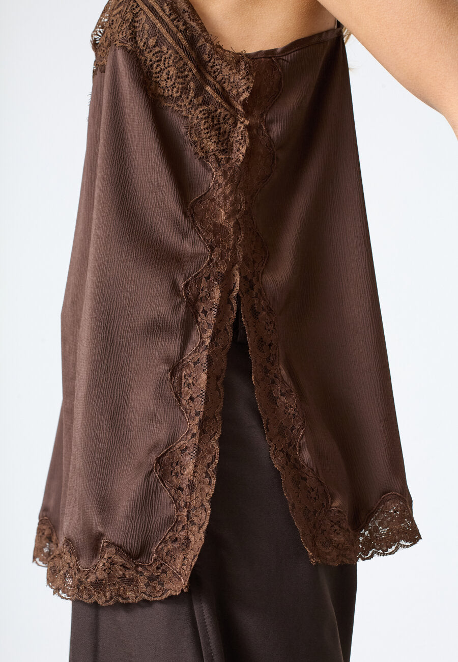 ISOLDE-ST1 er en eksklusive satin-top som er detaljeret med en smuk blondekant langs v-udskæringen og bunden. Toppen har tynde justerbare stropper. Modellen har en str. S på.