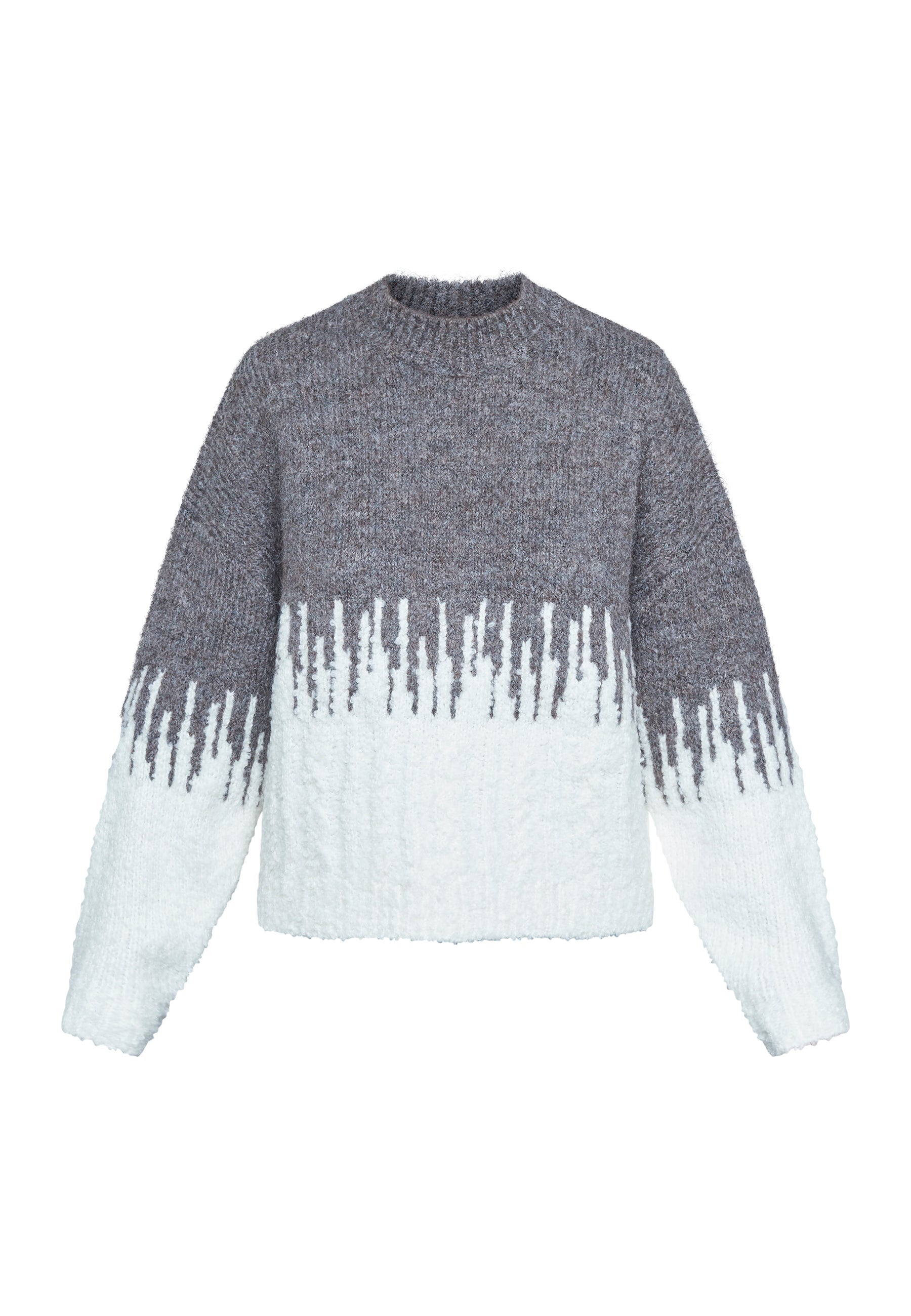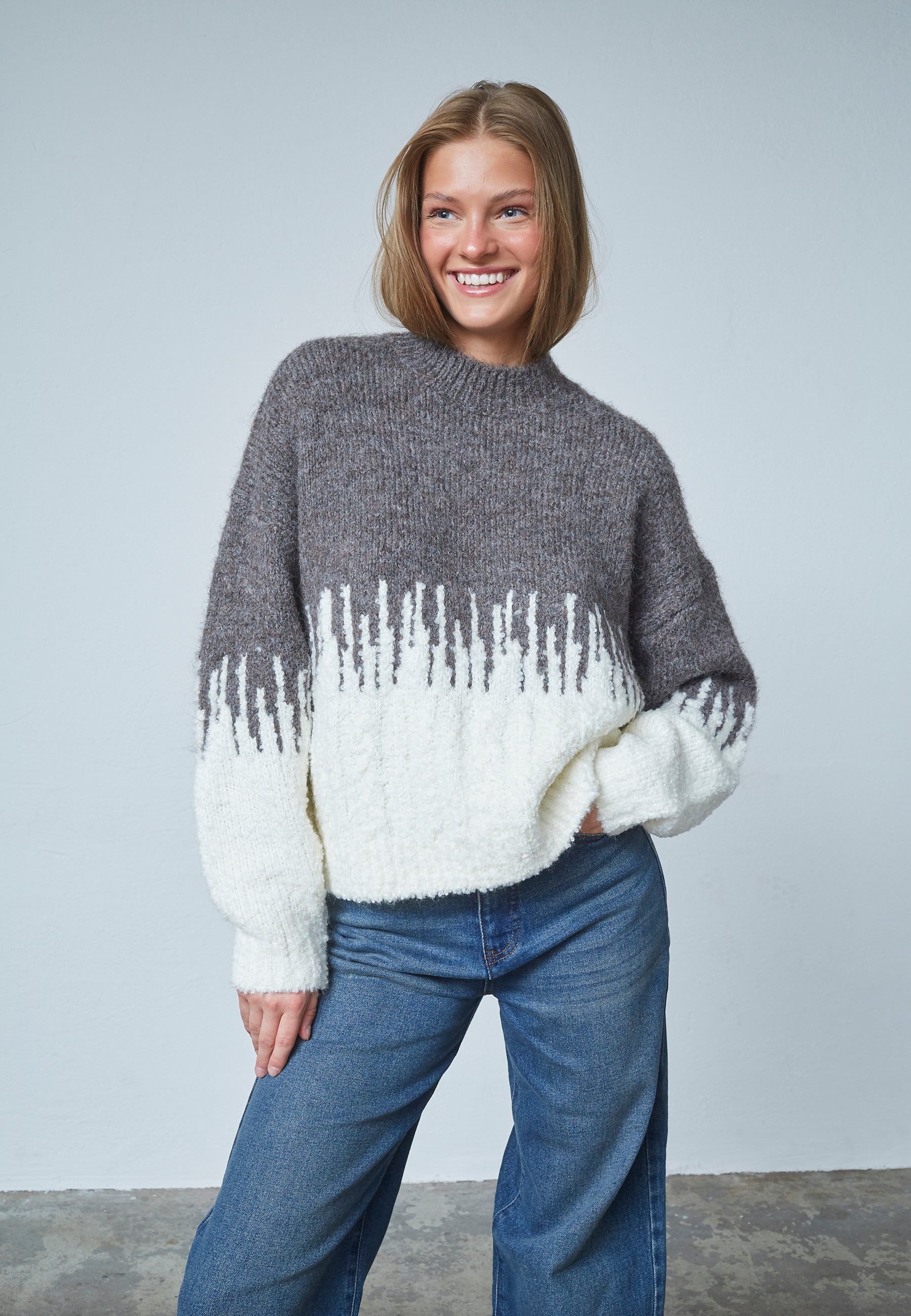 LIPSA-PU er en strikket sweater med lange ærmer og en rund hals. Sweateren har et unikt mønster, der kombinerer forskellige teksturer og giver et iøjnefaldende design. Modellen har en str. S på.
